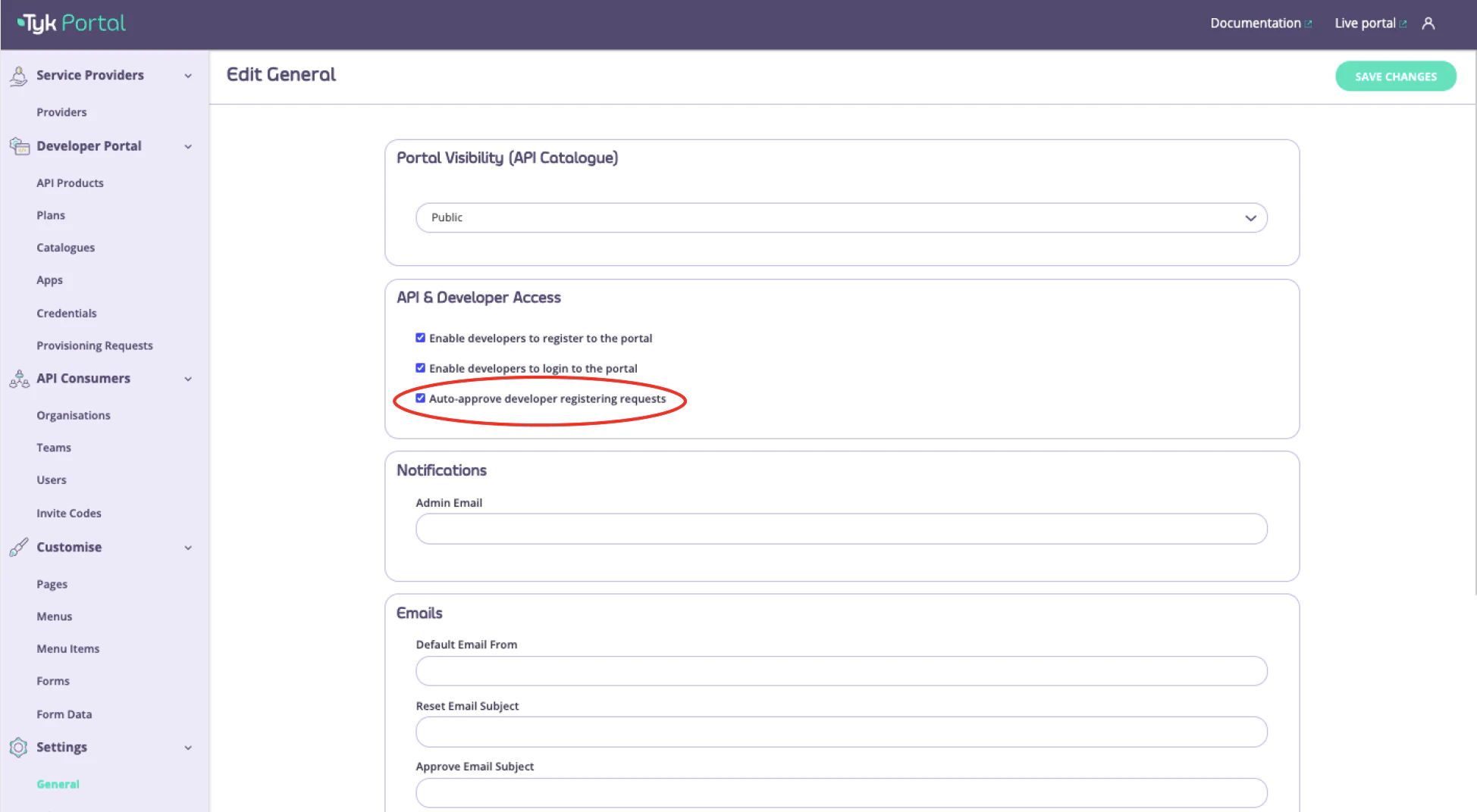 This setting is particularly useful for closed ecosystems where all potential users are pre-vetted or when you want to streamline the onboarding experience. Note: When automatic approval is enabled, all new registrations will immediately gain access to the Developer Portal without administrator review.